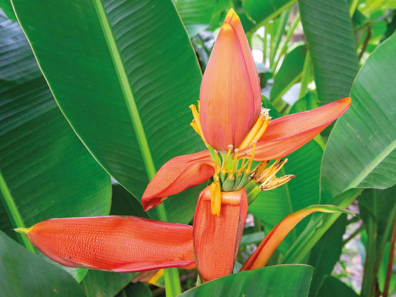 La pianta del Banano produce un casco di banane decorate da un fiore unico e straordinario dai colori vibranti che viene considerato un booster di buon umore grazie al ricchissimo contenuto di Vitamine (B6), minerali e aminoacidi.